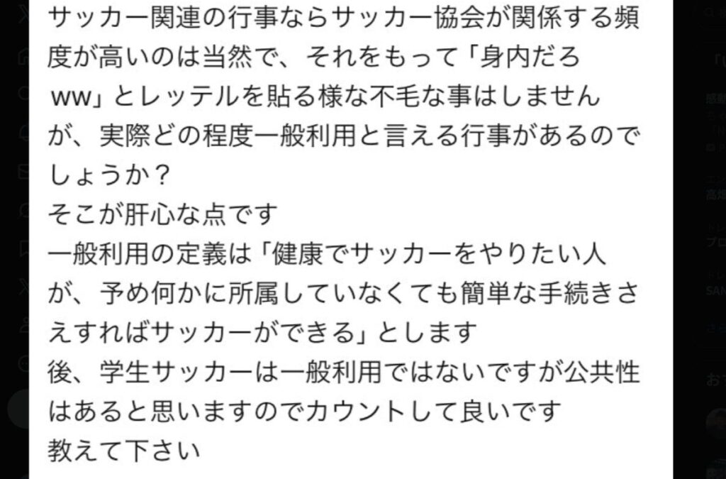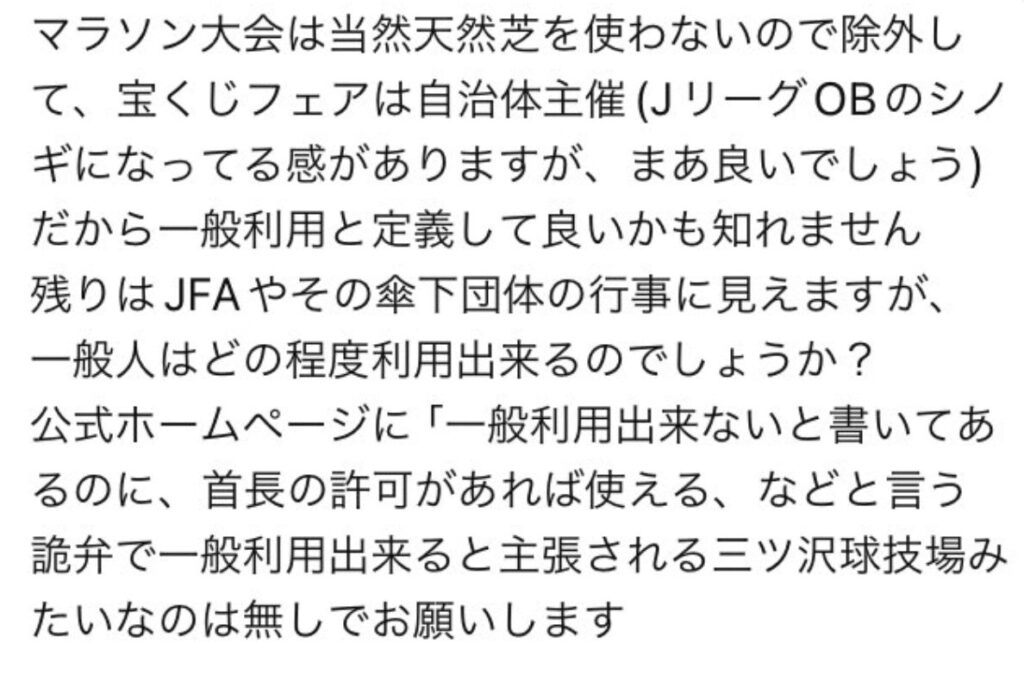 ただ、実際は三ツ沢球技場が毎年110日以上の利用はあって、メルカリスタジアム(カシマスタジアム)はJリーグの開催が20〜25日程度に対して、一般開放が60日以上あったりと、ちょっと調べれば「Jリーグが独占している」というのはデマであることが明確やちゃ。