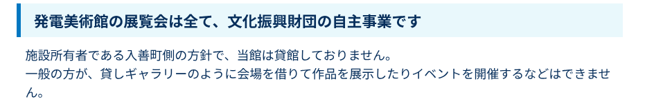 貸館は行っとるコスモホールはともかく、一般人に貸館を行ってない発電所美術館はよぉ、展示が許されるのはプロながやから、Jリーグに噛みついているあの人達がいう「プロが独占利用するなら税金に頼るな」を当てはめたら、発電所美術館は完全アウトになってしまうがやねぇ…。