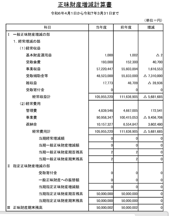じゃあ、発電所美術館の指定管理者になっとる「公益財団法人入善町文化振興財団」の事業報告の中にある「正味財産増減計算書」という、一般企業で言う「損益計算書」に当たるもんがあるがやけど、令和6年度ではこうなっとるちゃ。