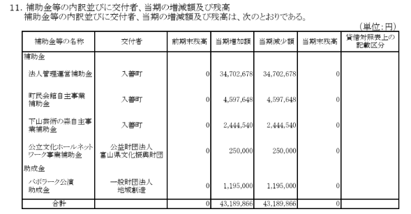 管理運営に関する補助金が3400万ほどになっとるがやね。入善町文化振興財団は、下山芸術の森の他に、コンサートホールのコスモホールがある入善町民会館の指定管理者になっとるがやけど、2箇所合わせた運営の補助金に当たる金額が3000万以上になるのが分かるちゃ。