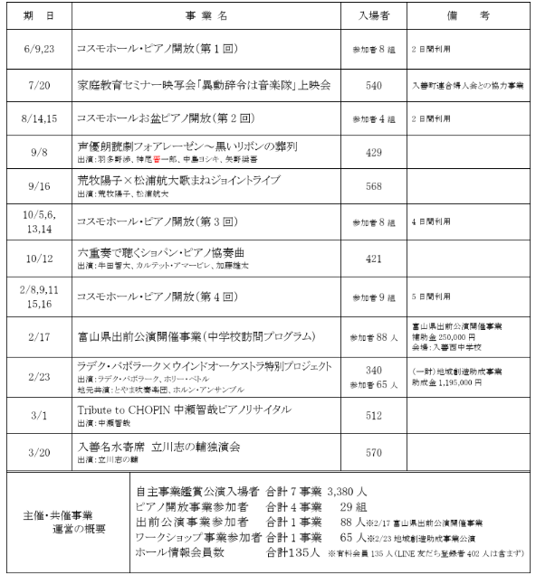 ということで「そんなピアノが市民に開放されているのか?」ということやけどよぉ、これは入善町文化振興の事業報告書に実績が出ているがよ。それがこちらやちゃ。