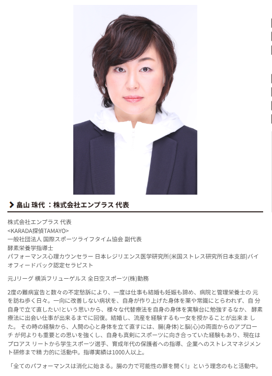 株式会社エンプレスの代表で、酵素栄養学指導士、パフォーマンス心理カウンセラー、日本レジリエンス医療研究所バイオフィードバック認定セラピストとか、聞いたことない肩書が多いがやけど、主な実績としてはスポーツ関連ではプロアスリートから学生アスリートまで、酵素栄養学や脳や腸の活性化を通じて、1000人以上を指導してきたようやちゃ。サッカー関連では結構名前が通っているようやのう。