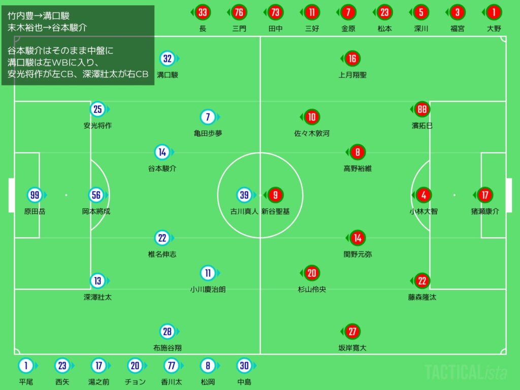 この交代は的確と言えるやろう。効果的なビルドアップができてなかった竹内豊に、中盤のポジションでありながら、これといって存在感を発揮できてなくて、ボールロストが多かった末木裕也を下げて、ボールキープ力がある谷本駿介を起用したという感じやろう。溝口駿は左WBに入って、安光将作が左CB、深澤壯太が右CBに入ったがやね。