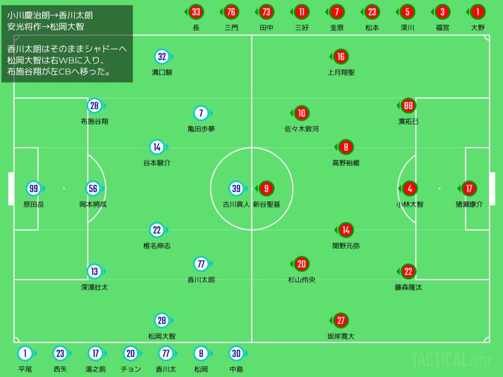 これは右サイドの強化の意味合いが強い交代やったのう。大外から仕掛けられる松岡大智がボールを運んでいって、ハーフスペースに香川太朗が入っていく感じながよ。ロングボールのターゲットになる古川真人も右サイドでボールを受けるようになり、この攻撃で右サイドからの攻撃回数が増えていったがよ。