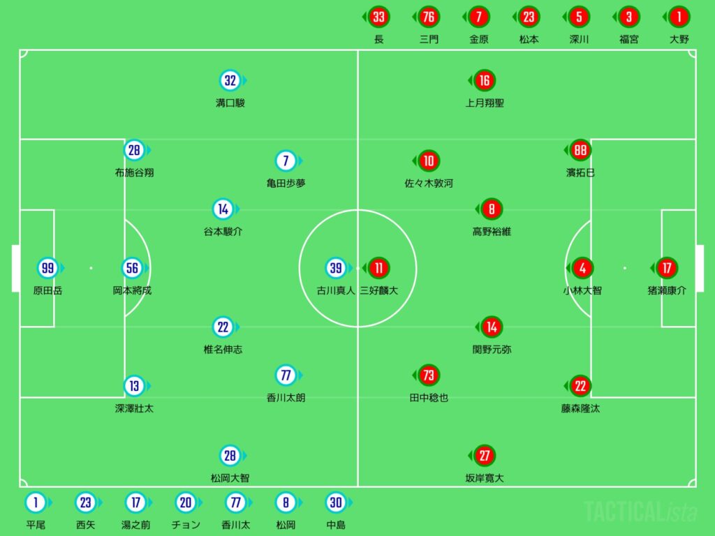 前線で奮闘していた新谷と杉山を下げて、昨シーズンの高知で4得点挙げている三好に、鹿児島から新加入の田中稔也を起用したがよ。前線の運動量が落ちてきているから、再び強度を上げていく狙いやちゃね。