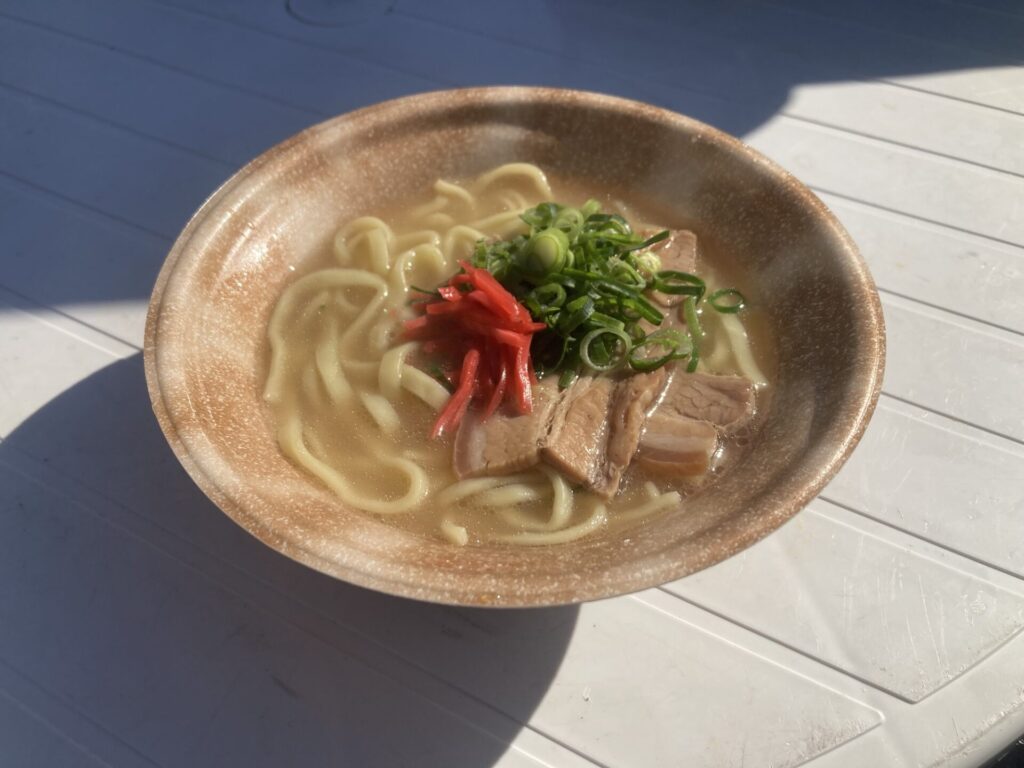 全国からいろんなラーメン屋がやってきて、いろいろ興味はあったがやけど、一番キュピーンと来たのが沖縄そばながやね。石垣島から直送のそばを使っている沖縄そばやったじゃ。豚の香りがプンプンしていてよぉ、独特の縮れ麺のうまさが良かったのう。ちょっこししょっぱめだったがで、オラとしてはもう少し塩弱めが良かったかのう?