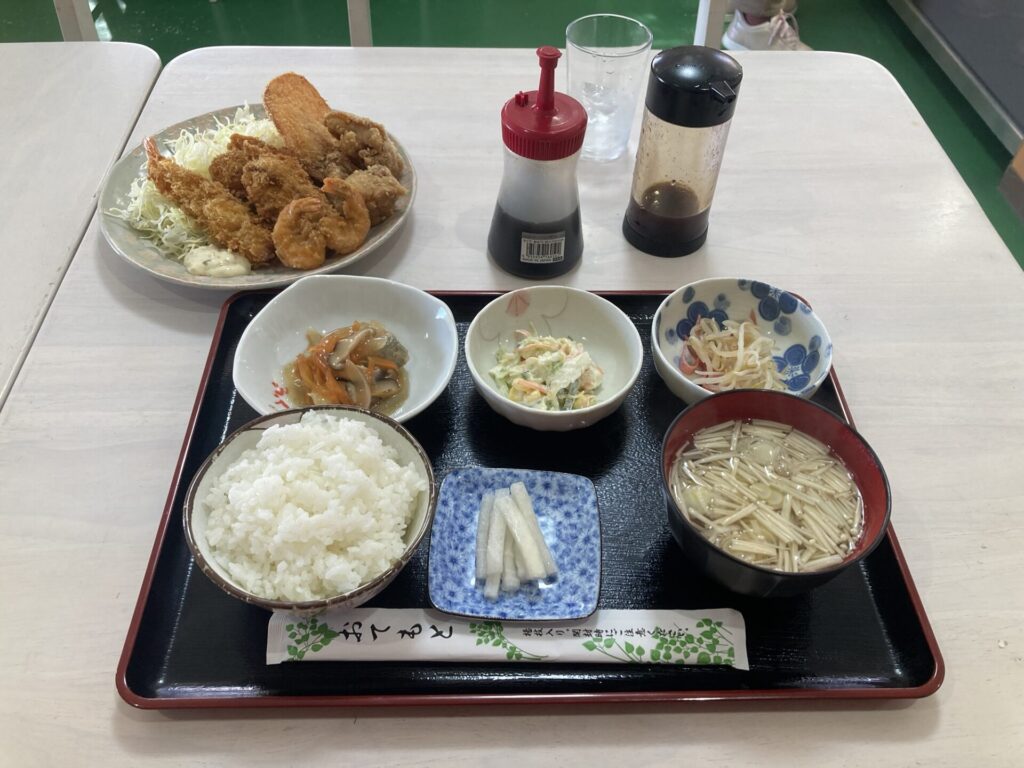 えのきの味噌汁、地元野菜をふんだんに使ったサラダ、きんぴら、そしてお漬物…。これだけでも結構イケてるなあと思っていたところで、あとからエビフライ、唐揚げ、チキンカツが入ったミックスフライまで出てきてよぉ、思わず店主さんに「え!これも定食ながですか?」と聞いてしまったもんやちゃ。