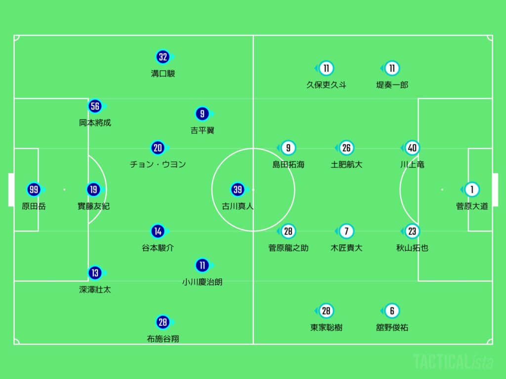 中盤の分厚さはカターレの方が上やけど、サイドではFC大阪という感じかなーと思えるちゃ。それ故にここまでの試合ではMVP級の活躍をしていた深澤壯太に対して、結構厳しいプレスが入ってくると考えられるやろう。この予想フォーメーションでは東家になるがやけど、彼の動きがちょっと鍵になるのかなーと思うところはあるのう。