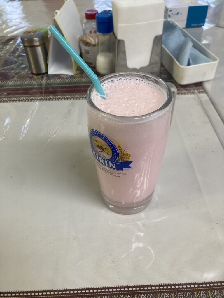 まずは最初の一杯やちゃ。イフタールではおなじみの「ローズドリンク」やちゃ。ローズシロップとミルクを混ぜたドリンクでよぉ、断食で乾いた喉を癒やすもんとして定番ながよ。