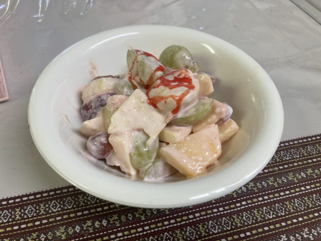 そして前菜のヨーグルトサラダやちゃ。りんご、ぶどう、キウイなどのフルーツがふんだんに使われとるちゃ。これも癒やされるちゃね…。