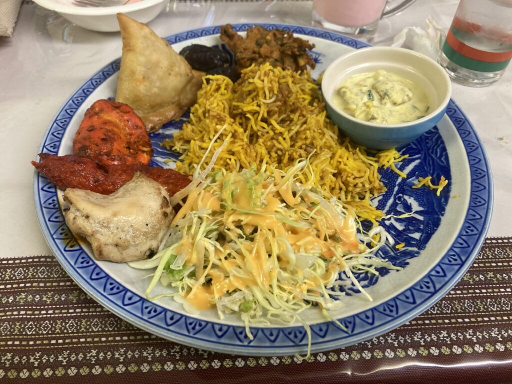 そしておかずやちゃ。ザイカでは毎回出してくださるプレーンのビリヤニにサラダがついているちゃ。左から手前側からホワイトチキン、シークカバブ、チキンティッカ、サモサ、デーツ、パコラ(ひよこ豆粉のかき揚げ)、ライタ(山羊乳のサラダ)やちゃ。これは豪華やちゃ。