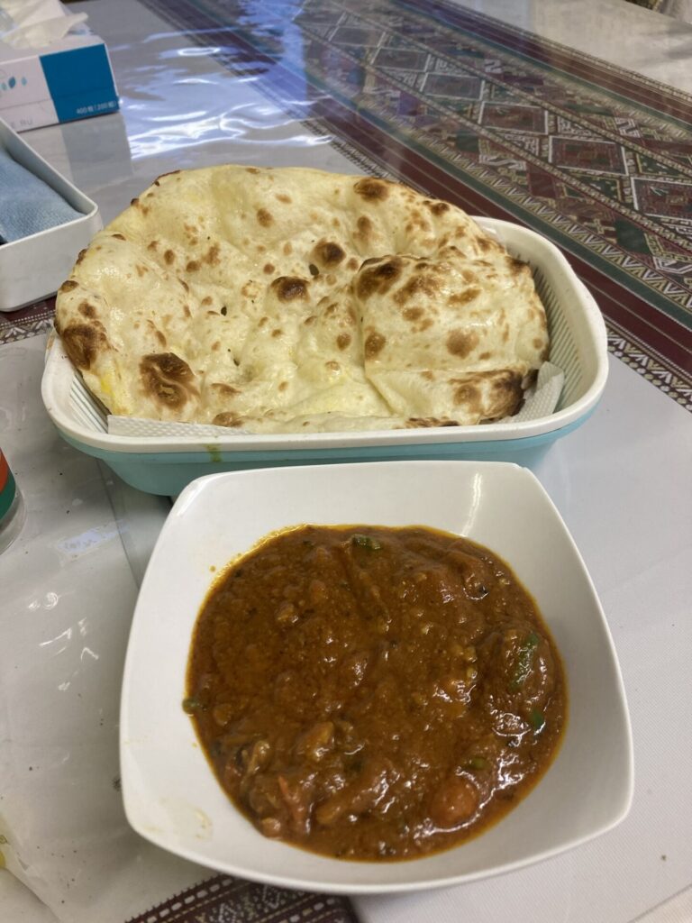 そしてマトンコルマとロティやちゃ。通常インド料理屋といえば、大きいナンが主流でザイカにもあるがやけど、パキスタン人の間では全粒粉で作られたロティが好まれることもあるちゃ。小麦よりも手に入りやすくて子供の頃から食べられとるということで、これを食べることで故郷を思い出すみたいやちゃ。
