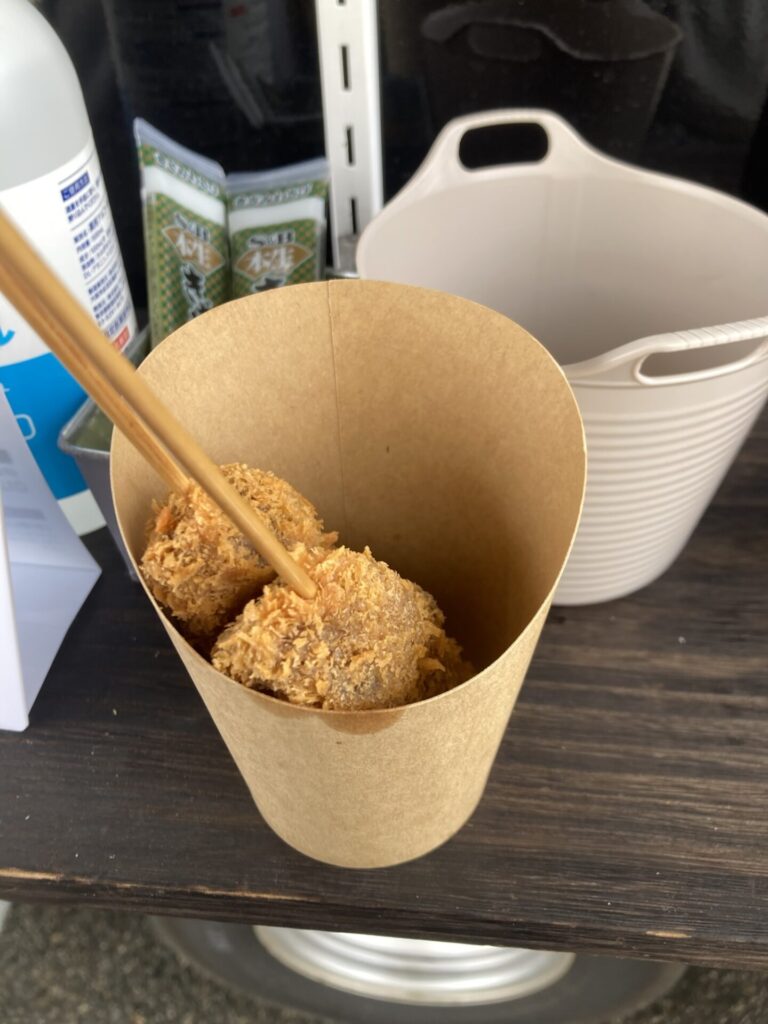 今回は牛カツ2本ながよ。これにソースかけて食べらーよ。うむ。これはうまいちゃ。