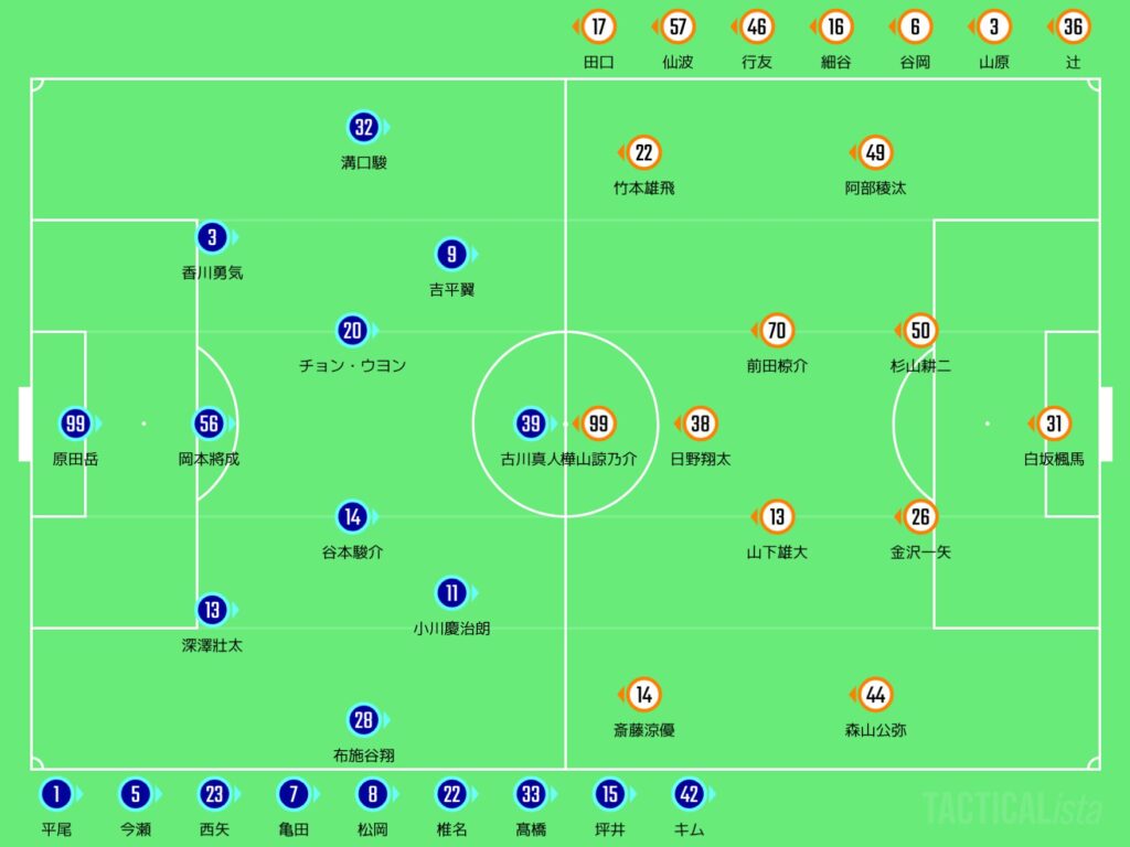カターレのスタメンやけど、前節脳震盪で途中交代の髙橋馨希はベンチで、溝口駿が左WBに入っとるちゃ。ベンチ入りやけどよぉ、この試合では初めて坪井清志郎が入っとるちゃ。どうも怪我していたらしいけど、ようやく戻ってきたじゃ。