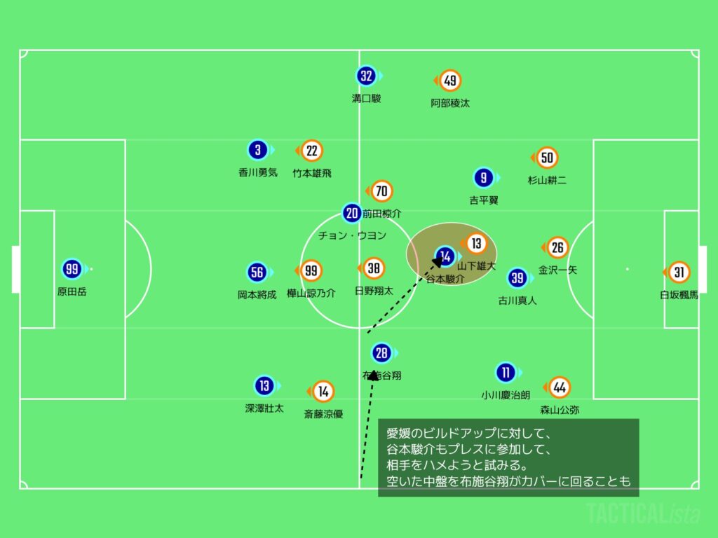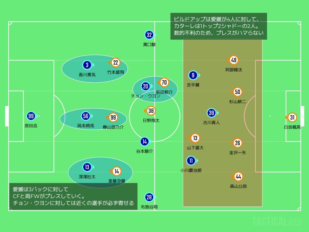 結構大きかったのは、讃岐戦、徳島戦で機能しまくっていたビルドアップに対して、愛媛がきっちりと潰しにかかってきたところやろう。3トップを敷いていることから、必ずカターレの3バックに対して、必ずハメていってたしよぉ、チョン・ウヨンに対してはかなり警戒していた感じやったのう。前田椋介や日野翔太の動きが良くて、チョン・ウヨンに対して、前を向かせないように徹底していたじゃ。