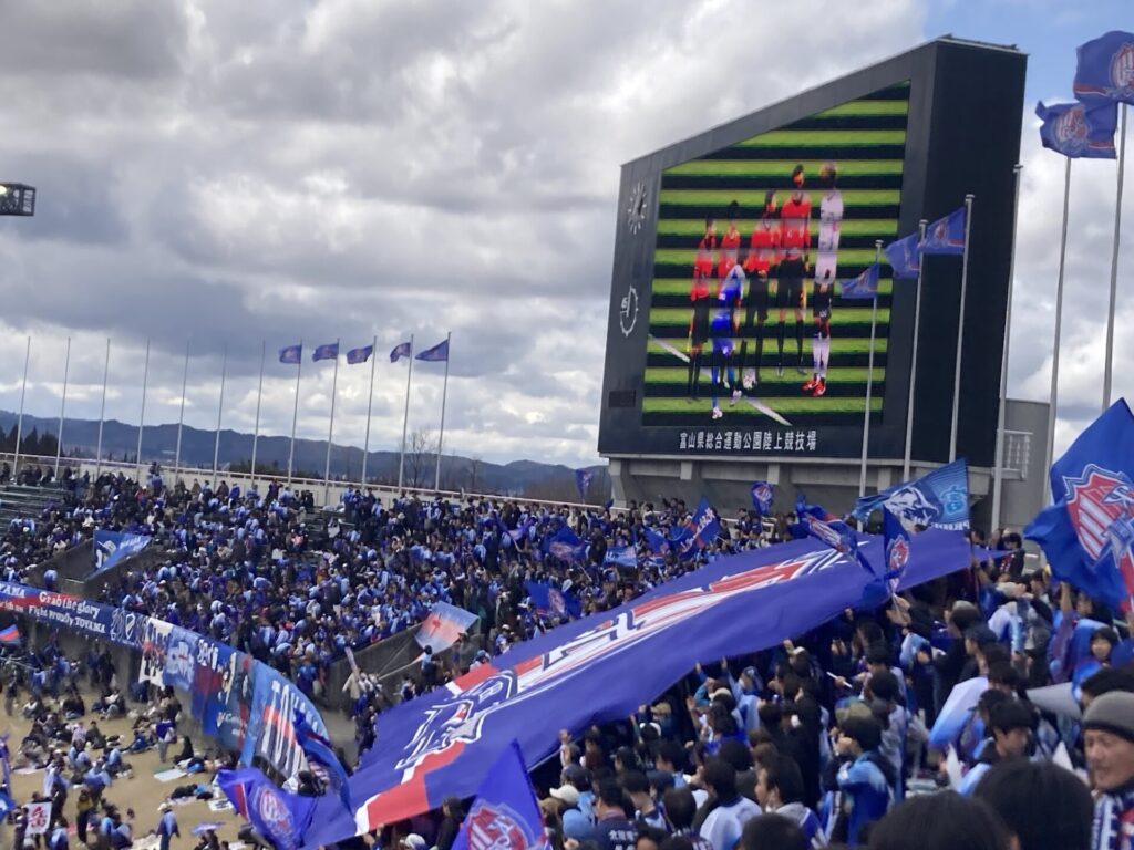 北陸ダービーということでよぉ、ゴール裏がパンパンに埋まっていたこともあってよぉ、今回はコレオが行われたじゃ。