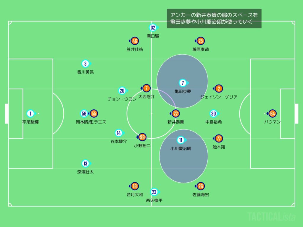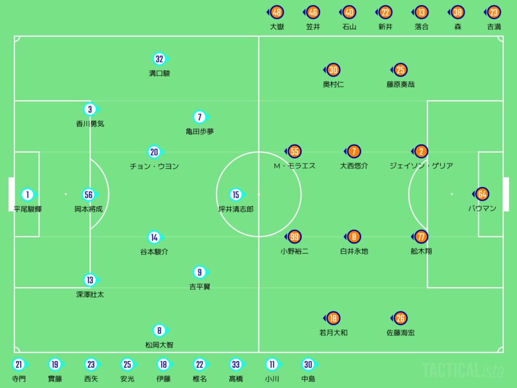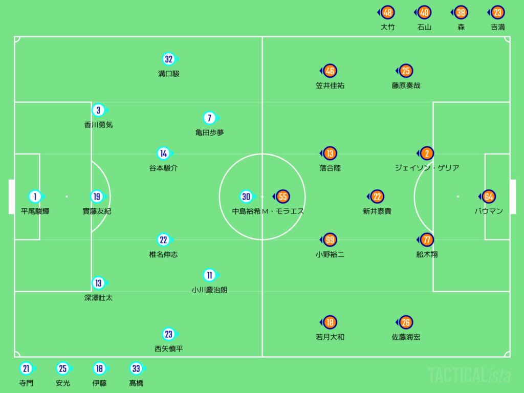 両サイドの選手がかなり高い位置を取っていて、フィールドを広く使うようになっとらーよ。そんで中盤やけど、精力的な小野裕二が受け手になりつつ、推進力がある大西悠介が攻撃的な位置に入って、白井永地がその2人とCBの間に入ってサポートするという感じやったのう。
