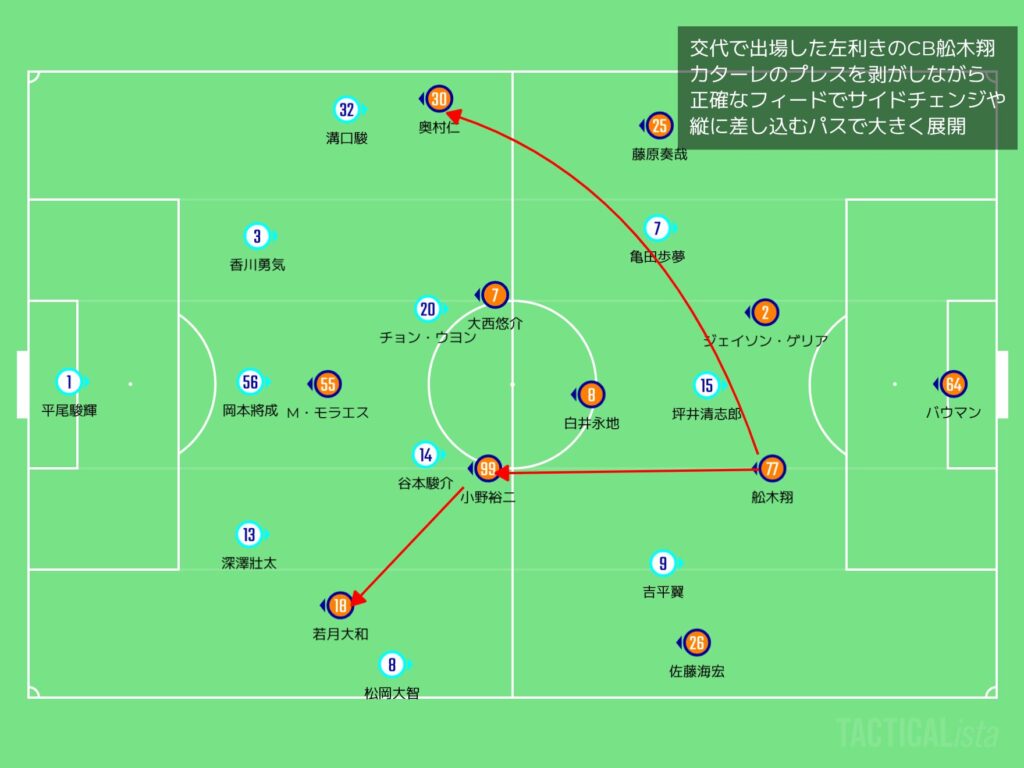 この戦術変更でアルビが優勢になってて、カターレは後手後手に回る展開やったのう。自陣に押し込まれる展開になって、ほぼ[5-4-1]の形でラインがズルズルっと下がる展開やったじゃ。カターレのプレスが緩くなる状況になっとったがやけど、この状況になってよぉ、左利きのCBの舩木翔のビルドアップが非常に脅威になっていたがよ。一発で右サイドへ展開するキック精度、鋭く差し込む縦パスでどんどん攻撃を仕掛けていたじゃ。