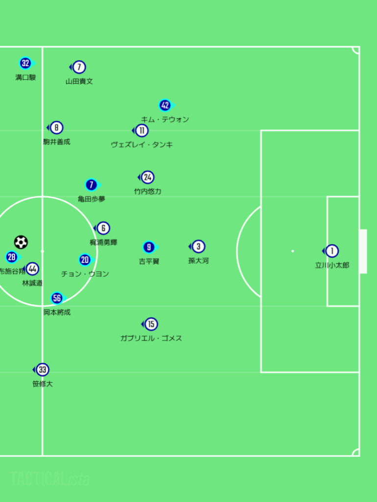 するとよぉ、持井響太が左サイドの裏のスペースにボールを蹴り込むと、笹修大が抜け出してカットインするがよ。そこで笹修大がそのままアーリークロスを入れると、ファーサイドから斜めに走ってきた林誠道が頭で合わせて同点ゴールながよ。これはやられたのう。