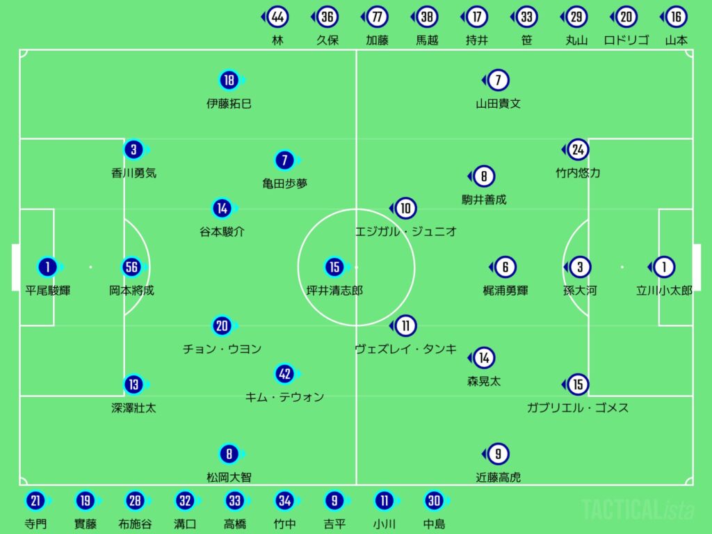 カターレのスタメンやけど、左サイドに伊藤拓巳が今季初出場ながよ。3トップは1トップに坪井清志郎で、セカンドトップに亀田歩夢と出場停止明けのキム・テウォンながよ。同じく出場停止明けの布施谷翔はベンチ入り、そして竹中元汰が初のベンチ入りやちゃ。