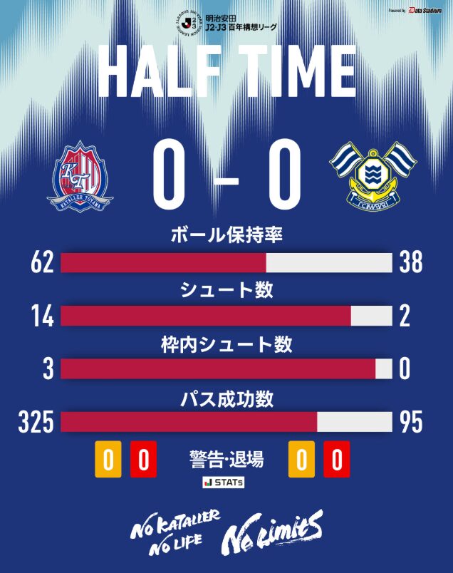 前半のうちからシュートを14本も放っているとは、まあ凄まじい状態やちゃ。ゲームも完全にカターレが押し込む形でよぉ、今治のクリアボールもほとんど拾いまくる展開やったがやね。今治はシンプルに2トップのヴェズレイ・タンキとエジガル・ジュニオに縦パスを送ろうとしたがやけど、岡本將成を始めとする守備陣がほとんどデュエルで勝っている状態で、カウンターを食らうような局面もなかったじゃ。