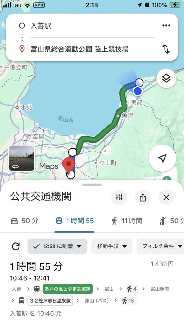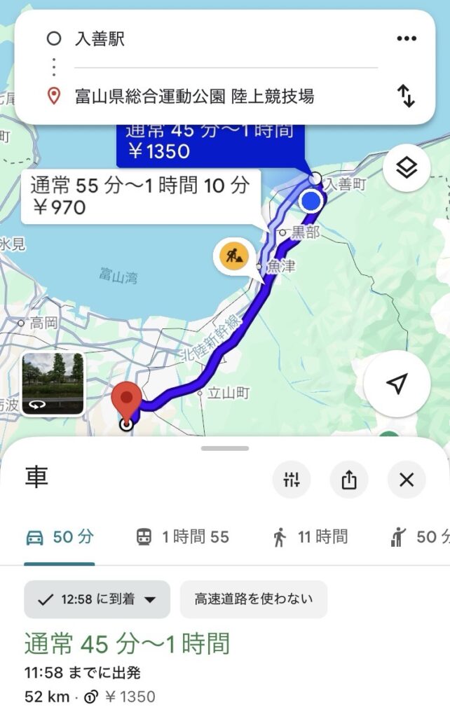 14時キックオフの試合を1時間前に到着することを考慮したがやけど、公共交通機関を使うと10時過ぎには出発しないといけない一方で、車やと高速道路で1時間弱ながで、車を使うのと使わないのでは1時間ほど違ってくるがよ。富山市の中心部で住んでいる人にとっては、圧倒的に公共交通機関を使えばいいところやけど、離れるとどうしても車になるとこやのう。