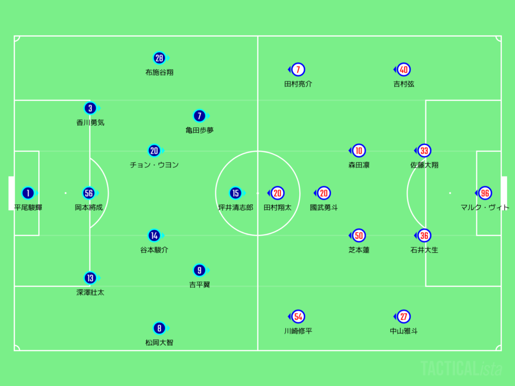 カターレのシステムは[3-4-2-1]で、奈良クラブは[4-2-3-1]になるがで、お互いのシステムにはギャップが生まれるやろう。かみ合わせで考えたら、中央はカターレの方が人数多くて、サイドは奈良が人数多いという感じやけど、よりワイドに攻撃しやすいのがカターレで、割と万能性があるのが奈良クラブのシステム…というとこかのう。