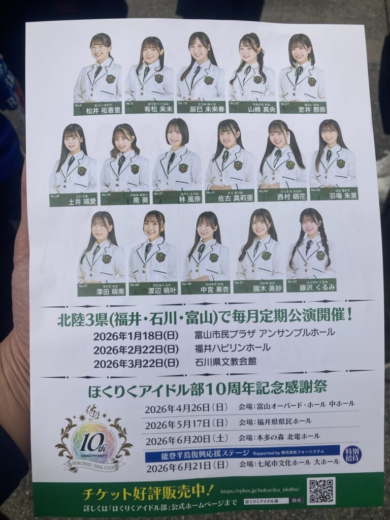 ほくりくアイドル部が10周年記念で記念感謝祭が行われるということで、チラシ配っとらっしゃったじゃ。