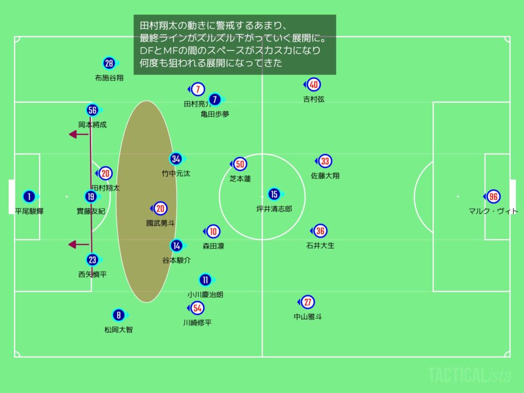 まず、最終ラインが1トップの田村翔太の動きに釣られて、ズルズルと下がる展開になるがよ。カターレとしてはなるべく高い位置からボールを奪っていきたいところやったがやけど、前の選手が出ていく一方で、後ろがついていかない展開になってよぉ、全体が間延びしてきたがやね。
