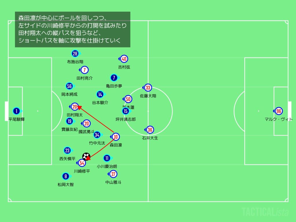 奈良の攻撃は森田凛を軸にしながら、左サイドの川崎修平が一つの起点になっていて、エースの田村翔太がゴール前への飛び出しを伺っていく感じやったじゃ。