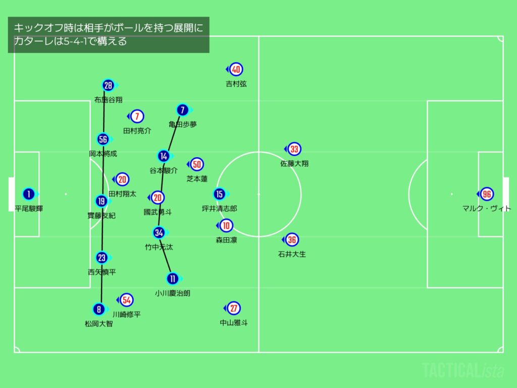カターレがまず守備から入ったわけやけどよぉ、これは単純に「耐えていく」というような感じやないがやね。むしろよぉ、相手の守備陣のスペースを作るための戦術と言えるやろう。