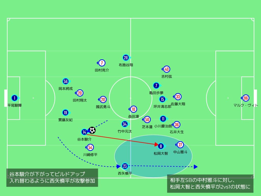 田村翔太の個人技が素晴らしかったとも言えるがやけど、GK含めて4人がついていたがに、そこで決められてしまうディフェンスというのは、どういうことながよ…と正直思ってしまうちゃね。後方から奪いに行った實藤友紀があっさりかわされてしまったわけやけど、こういう局面でよぉ、守備陣で連携して、コースの限定など行いながら止めていくのは、カターレとしては今後必要なことではないかと思ったじゃ。