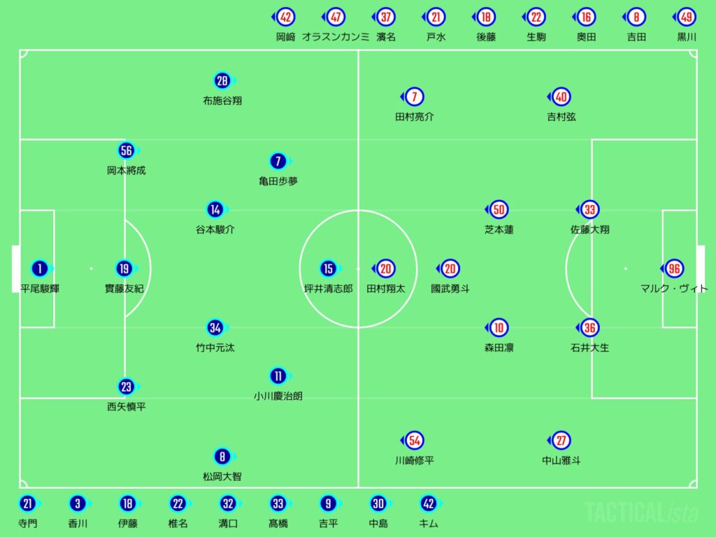 カターレのスタメンやけど、開幕からスタメンで出場していた深澤壯太と、開幕2戦目からスタメン出場が続いていたチョン・ウヨンがベンチ外ながよ。西矢慎平と竹中元汰が初スタメンやちゃ。前節スタメンの伊藤拓巳、香川勇気、キム・テウォンはベンチスタートながよ。