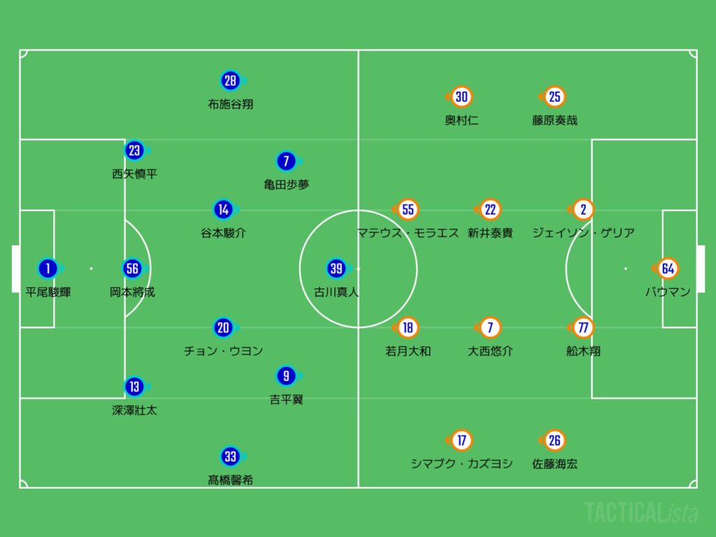 前半にカターレがハイプレスで流れを掴んだらよぉ、コーナーキックから坪井清志郎のゴールで先制をしたらよぉ、今度は相手GKバウマンがバックパスをキャッチしてしまったがで、間接フリーキックを得ると、その流れから坪井清志郎が再びゴールやちゃ。更にフリーキックから岡本將成が昨シーズンまで所属していた古巣相手にJリーグ初ゴールを決めて3-0で折り返したがやね。