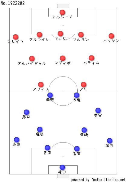 右サイドにボールが渡ったときは、フリーマンのアフィフに酒井宏樹がついて、堂安が左WBのハッサンに付きながら相手を詰めていくがいど、このときにアルハイドスを見ているのが原口ながやね。それが起点になるフーヒに渡るとこんな感じになっていくがいちゃ。