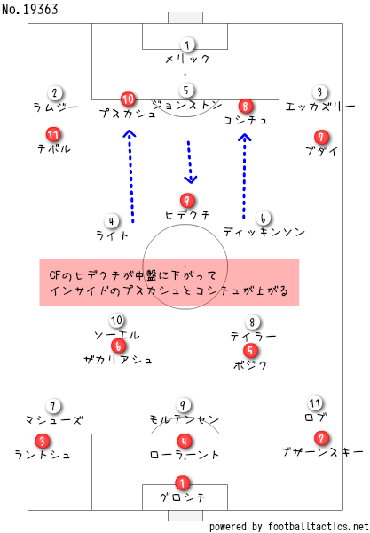 なんとセンターフォワードのナンドール・ヒデクチが下がってよぉ、インサイドにおったプスカシュとコシチュが最前線に上がってきたがやね。