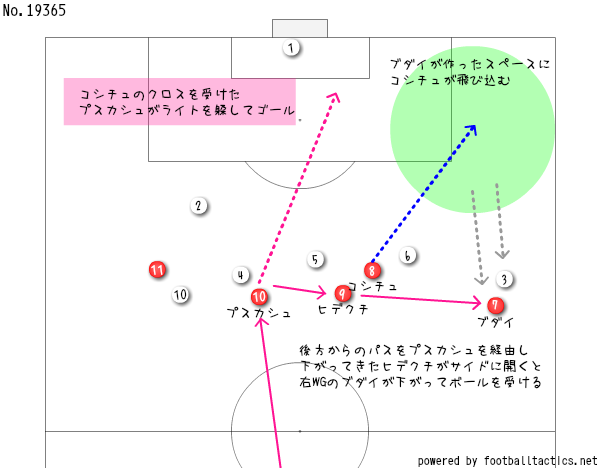 今度もまたヒデクチが下がって来てよぉ、ポストプレー(この当時で?)で右サイドに開くと、右WGのブダイが下がってきてよぉ、対面のエッカズリーを引きずり出すと、そこの裏のスペースにパスを出すがいちゃ。そこに走ってきたのは右インサイドのコシチュが抜け出してよぉ、そこからクロス。ニアに入ってきたプスカシュがフェイントでライトを躱して、思いっきりゴール天井を突き刺すゴールを決めて3点目やちゃ。