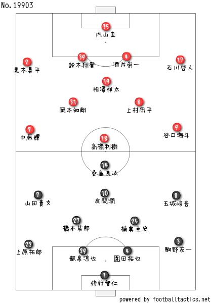 2トップの一角の有間潤がちょこまか動きながらパスを引き出して、左右の選手との連携を経て崩していこうとするか、または駒野の大外からのクロスで狙っていく…という感じやのう。