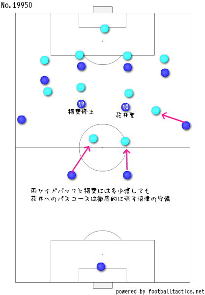 そうなってくるとカターレはサイドにボールを渡して、そこから攻めてこうとするところやけど、沼津はボールサイドへ一気にスライドしていって、前へ行かせんようにしとったがいちゃ。
