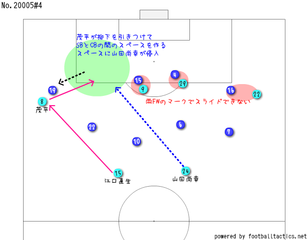 カターレとしては本当はスライドでもしてSBとCBのスペースを埋めていく必要はあるがいど、この試合でのカターレの守備としては、この強力2トップから目を離さないことを徹底されとったから、こういうのは起きるがでしょう。その場合は中盤の誰かがスペースを埋めていかんなんところやけど、まあこれは次に活かして欲しいちゃね。