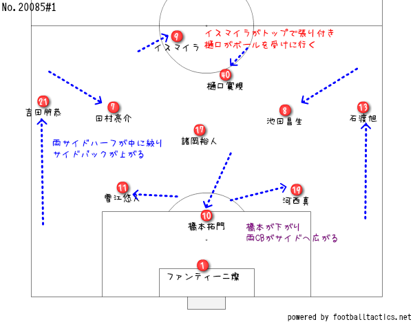 両サイドバックは上がっていって、中央に人を集めて、真ん中でショートパスをつなぎながら、サイドやCFのイスマイラにボールを供給していく…という感じのチームスタイルながいちゃね。あんましロングレンジのパスは多用しないで、ひたすら繋いで相手を引き寄せたら、スルーパスとかどんどん狙っていく…という感じながいちゃ。