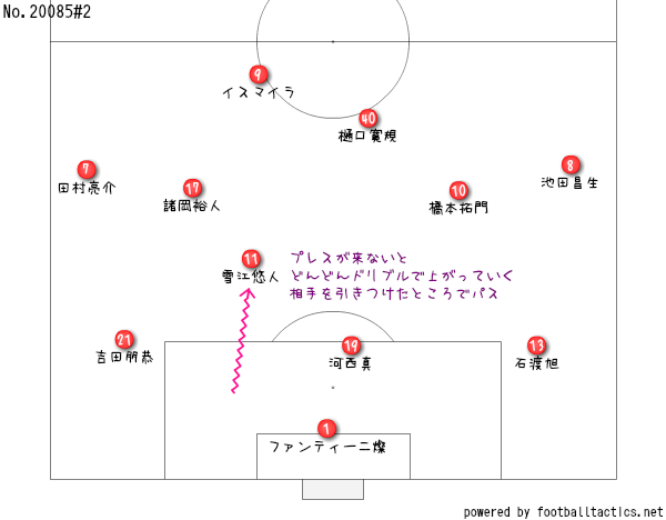この雪江選手がビルドアップのアクセントになっとるところは、すごく注目するところかとオラは思うちゃ。まあ結構尖っている部分やから、カターレとの対戦では外してくる可能性も否定できんねど…。
