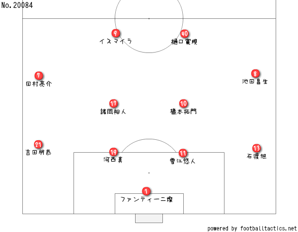 フォーメーションは昨シーズン同様の4-4-2やちゃね。中盤の顔ぶれなんて、昨シーズンと大きく変わったところがないくらい、お馴染みの選手が揃っとるちゃね。武颯がいたポジションには、2年目のイスマイラが…という感じやちゃ。