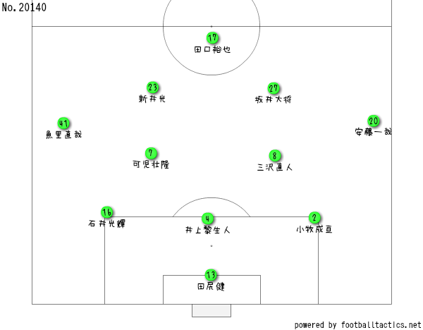 ゴール前での崩し方は、横方向でボールを動かして、最後は真ん中を狙ってくる…という感じやけど、中央の3人は左足で良いキックを持っている新井光に、相手を背負ってプレーできるルーキーの田口裕也、そして狭いスペースでボールを持ちながらちょこまかと動く坂井大将の誰かが狙っていくという感じやのう。そんでバイタルが空いたら、可児と三沢がミドルで狙っていく…という感じやろう。
