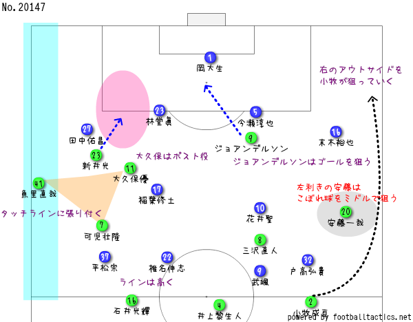 そんで逆サイドの安藤一哉は利き足が左ながやね。彼にボールが渡ったら、基本的には中に入り込んでシュートかパスを狙っていく感じやちゃね。その後ろに元々サイドアタッカーの小牧が起用されとるのは何でかと思っていたら、安藤が中に入る動きに連動して、右のアウトサイドをエグッていく役割を担っとったがいちゃ。