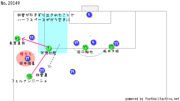 これは本当に酷い失点やったのう。林堂が引きずり出されるところで、右のインサイドがガラ空きになるとこながに、そのスペースを絞ろうとしないからのう。魚里、フェルナンジーニョ、可児の3人のコンビで林堂と田中をペナルティエリアの外に出された時点でまずくて、エリア外は中盤の選手に任せるくらいでないといけんがに、まんまと相手がやりたい放題のスペースを作ってしまうがやね…。