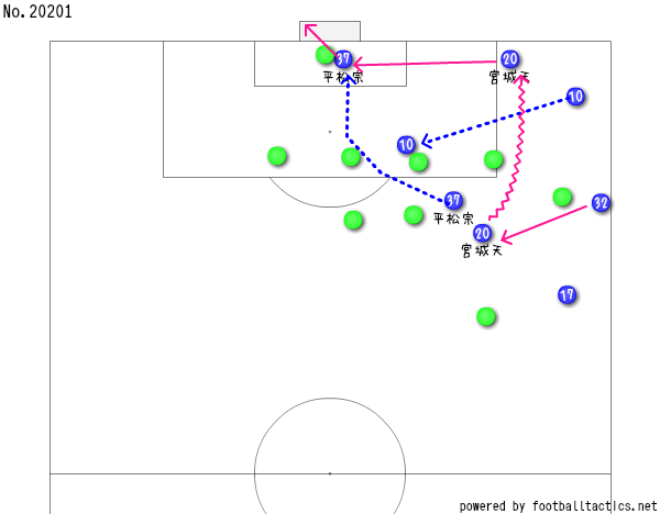 立ち上がり早々の6分に試合が動いて、タッチライン際でボールを受けた戸高に、逆サイドから来た宮城天がボールを受けに来ると、そのまま縦へ突破してクロスを入れると、最後は平松がボールのコースを変えてゴールやちゃ。