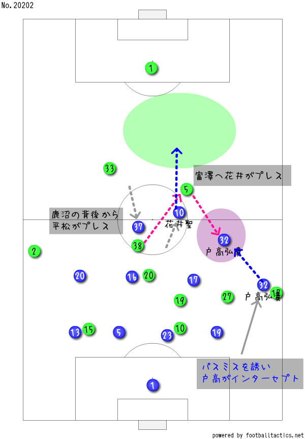 左サイドから展開しようとした相模原に対して、プレスをかけ続けてバックパスを誘ったら、最終ラインで富澤のパスミスを誘発させて、これを戸髙がインターセプトして、ダイレクトで裏に入れるとよぉ、ディフェンスラインを突破した花井が相手GKビクトルとの1対1を制して、2点目取れたじゃ。