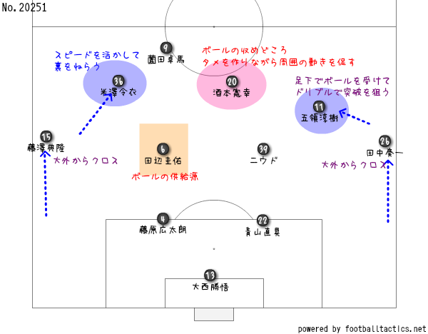 これはえらい驚きながいど、CFの位置にいてボールを収めながら、裏を狙っていく米澤令衣にスルーパスを出したり、近くでボールを受けに来る五領淳樹に渡して、彼の突破力から打開していったりと、周りを使っていくのが上手い選手やちゃね。そしてゴール前ではしっかり詰めていく集中力も備わっとるちゃね。もちろん元々守備の選手やっただけに守備面での貢献も大きく、今やオールラウンドなFWと言えるやろう。