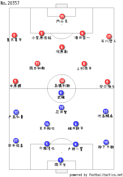 ロアッソ熊本のスタメンは、前節とは異なるのは3センターの一角が伊東俊から岡本知剛に変わったところだけやちゃね。中2日やけどメンバーは変えてないちゃ。